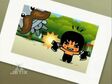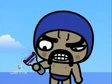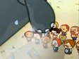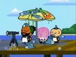 The Ninja boy is shy to approach the mascot figure who suddenly steals a kiss from him in the midst of the picture, revealing to be Pucca in the costume. This leads to the usual chase scene, though Garu manages to escape by latching a grappling hook onto a dugong hot air balloon. Pucca is not pleased but is quickly distracted when she sees Muji diving into the lagoon with an electric razor (which we'll assume is waterproof). She confronts him in the water and they do battle, which ends with Pucca tying his mustache in a knot and sending him flying.