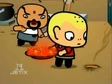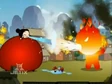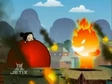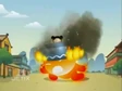 The fire goblins join together to create a giant monster that breathes fire all over the place. The Fire Brigade is at a loss, but Pucca has a plan, drinking all the water from the lake and using it to extinguish the monster, the spray back of which puts out all the other fires in the village. However, the monster reignites and chases after the girl until she reaches the Goh-Rong Restaurant. Using the giant bowl on the roof (after discarding the metal noodles on top of Dada), she presses the bowl down on top of the monster until it’s squashed flat into the ground, suffocating the fire. Underneath, the sooty but once again friendly goblins have returned to normal and begin rebuilding everything they’d destroyed. The Chefs mention they’ll want a banquet for these repairs and eagerly set back to cooking.