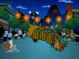 Down in the village, the inhabitants watch the dragon dancers parade through the street while Pucca chases after Garu. The boy ducks out of sight behind a street corner but is picked up by another dragon dancer costume worn by Pucca (and apparently Ching). He cries out as Pucca kisses him inside of the costume while they dance off down the road beneath the fireworks.