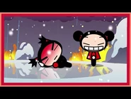 On a snowy winter’s day, Dada tiredly climbs up a large hill. Reaching the top, he pulls out a frying pan and uses it as a sled, though as can be expected, he crashes. The other villagers are also playing in the snow with Ching and Abyo making snowmen. Abyo, upon finishing his, proceeds to rip off his shirt and fight with it, then runs off to escape the cold. Garu creates a perfect snow-bonsai tree but it is flattened by Pucca’s giant snow-sculpture of the two of them kissing. Garu is annoyed by this and walks away. Tobe watches them go, the runs off to his own base to prepare his lasts scheme. From his shed, he and his minions drive off in his new snowplow machine.