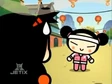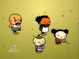 But Pucca is not done. She returns to the battle with a fiddle in her hands and as she plays a country tune, the giant robot has no choice but to break into dance. The chefs join in with their niece to lead the square dance out of Sooga Village and up to cliff where the robot dances right off the edge. The Lougies swear to return as they fall out of sight.