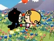 It’s evening and Garu desperately looks for a place to hide, but is found and smooched by Pucca. They continue this game until crashing into a pile of trashcans which leads Officer Bruce in his police helicopter to scold them for disturbing the peace. Garu jumps into the chopper to escape but once again, Pucca is already there in waiting. When she makes a lunge for him, Bruce’s latte is knocked over, causing him to panic and lose control of the helicopter. They are blown off course through a storm cloud ad by the time Bruce regains control over the chopper (and his mocha latte) they are in a strange new place.