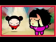Later in the kitchen, the chefs try to figure out why Pucca would be doing such things and blame themselves for her behavior and knowledge her innocence. Ching sneaks into the kitchen and turns one of the cooking pots up to high before running away. Up in her own room, Pucca continues to cry into her pillow until feeling the rumble from the kitchen. Her room suddenly explodes and she is sent flying into the air (which she is surprised but enjoys it until). Up high, she spies Ching (with a greenish completion) smiling evilly and she becomes angry. Ching laughs and runs off, showing Pucca the sock on her back. Pucca runs after Ching who taunts the girl, destroying everything in her path and blaming it on Pucca as they go.